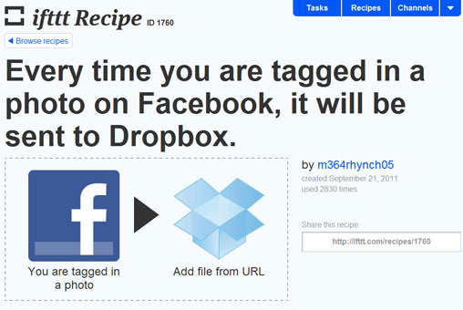 IFTTT gør det muligt for dig at definere et antal regler ud fra formularen: "Hvis dette sker, så gør dette" ved hjælp af en kombination af udløsende faktorer og handlinger. Du kan for eksempel fortælle servicen, at den skal overvåge din Facebook-profil og automatisk uploade alle billeder, du er tagget i, til Dropbox. Eller du kan sætte den til automatisk at gemme alle nyheder, du giver en stjerne i Google Læser, i Instapaper eller Evernote. Du kan endda sætte servicen til at snuppe alle billeder, du uploader til Facebook, og automatisk også sende dem til Picasa.