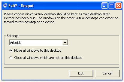 Når du lukker Dexpot, har du mulighed for at bringe åbne applikationer med over på hovedskrivebordet.