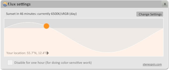 Men jeg lod programmet køre, og efter en times tid prøvede jeg at slå det fra. Det var som at stirre direkte mod solen. Jeg slog F.lux til igen med det samme og har nu brugt det siden.