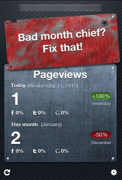 Når du åbner app'en, bliver du præsenteret for en skærm, der fortæller dig, hvor mange sidevisninger du har haft i dag og i denne måned, og du får også oplyst, hvor stor en del af de besøgende, der kommer fra Twitter, Facebook og Google.