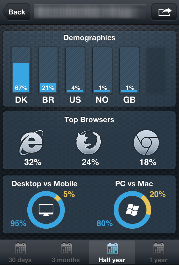 Med et enkelt tryk på åbningsskærmen ryger du dog videre til en mere detaljeret oversigt, der fortæller dig, hvor dine besøgende kommer fra i verden, hvilken browser de bruger, og hvordan fordelingen er mellem Mac og pc-brugere, samt hvor mange af dine besøgende, der kommer via en mobiltelefon.