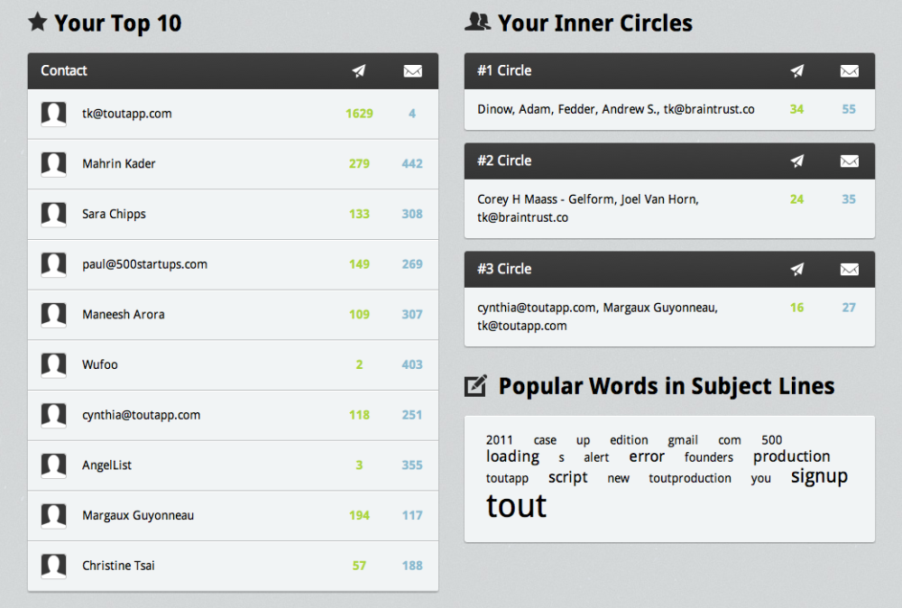ToutApp giver dig også en statistik over, hvilke ti personer du kontakter mest, og Tout fordeler desuden alle dine kontakter i tre forskellige cirkler. De personer du kontakter oftest bliver placeret i den inderste cirkel, mens folk du kontakter knap så ofte bliver placeret i de yderste cirkler.