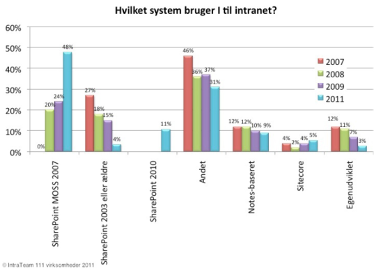 Hvert år laver IntraTeam en spørgeskemaundersøgelse, og blandt de 111 virksomheder, der deltog i 2011, tegnede der sig et klart billede af, at SharePoint er den mest dominerende løsning.