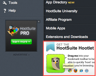 Du kan nemlig tilføje et særligt Hootsuite-bogmærke til din browsers menulinje, og med et enkelt klik på bogmærket kan du dele dine links på de sociale medier.