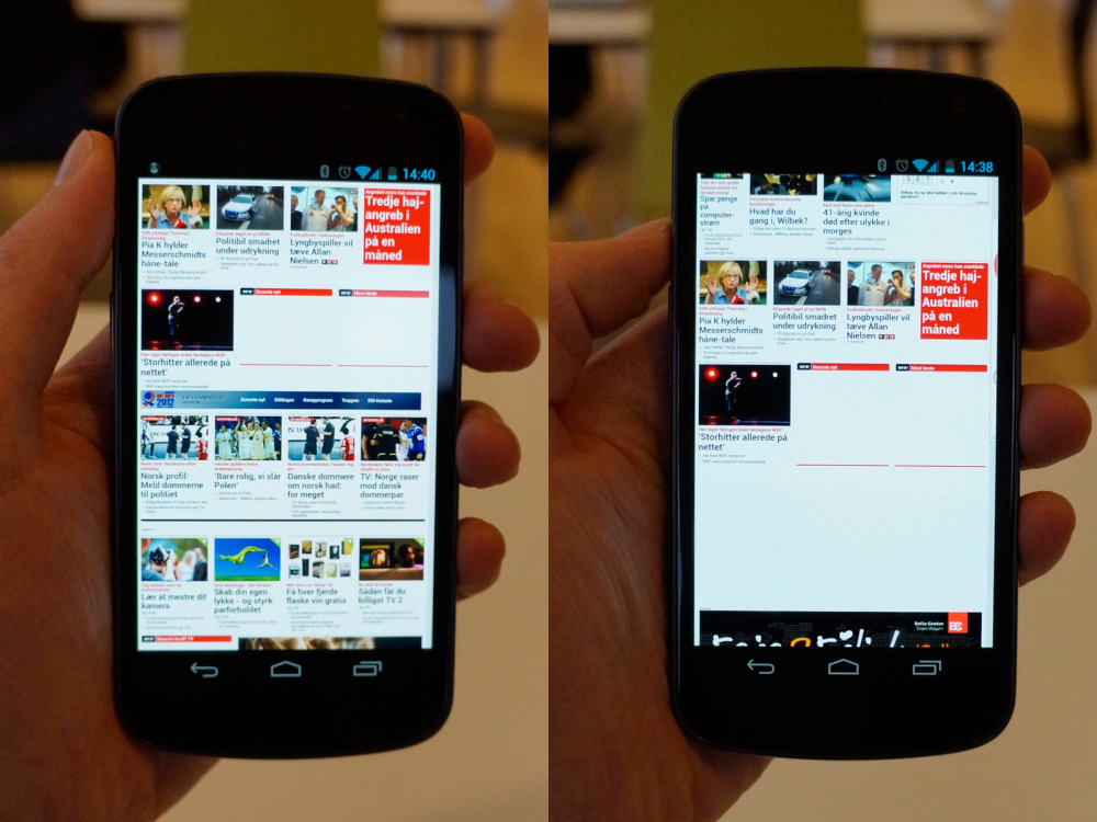 Desværre er browseren alligevel en stor skuffelse på Samsung Galaxy Nexus. På de mobile websider for aviser som Politiken, Jyllands-Posten Ekstra Bladet og B.T. kan mobilen fint vise alt indhold korrekt - men på deres almindelige web-udgaver oplevede vi, at det flere gange gik galt på blandt andet Politiken.dk og BT.dk.