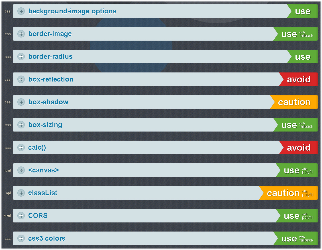 Siden anbefaler blandt andet, at man uden problemer kan bruge de nye audio- og video-tags i HTML5, men at man eksempelvis skal lade være med at bruge tagget input type="color", fordi kun Opera-browseren endnu understøtter den funktion.