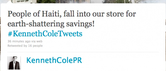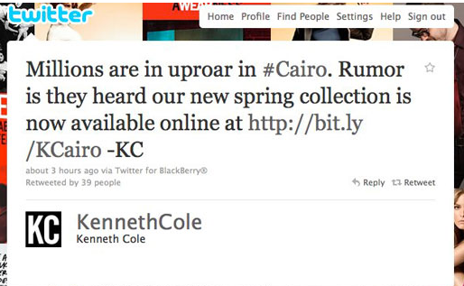 Ikke helt overraskende var mange twitter-brugere forargede over, at Kenneth Cole brugte den alvorlige og anspændte situation i Kairos gader til at promovere sin nye forårskollektion, og blot halvanden time senere måtte firmaet da også rykke ud med en undskyldning.
