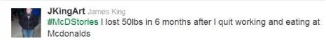 Eksempelvis er der en bruger, der takker McDonald's for, at hun har pådraget sig type-II diabetes, og en anden bruger fortæller, at han tabte adskillige kilo, efter at han holdt op med at arbejde på kædens restauranter.