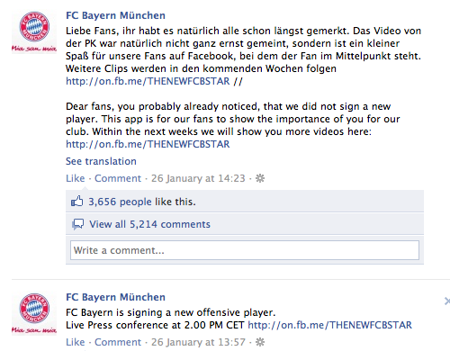 Men da det nye navn skulle annonceres, modtag fansene blot et link til en ny Facebook-app, der kan lave en billedmanipulation, der betyder, at fansene bliver iklædt en Bayern Münchens-trøje på deres Facebook-billede.