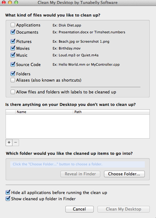 Vil du eksempelvis have fjernet film og billedfiler, men bevare dine genveje og mapper, kan du indstille Clean My Desktop til at gøre det.