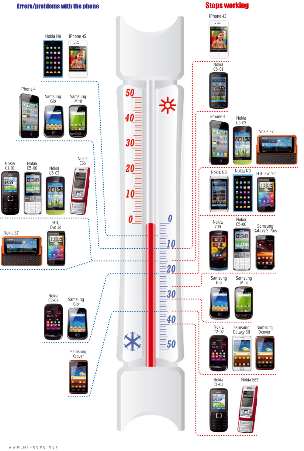 HTC og Nokia angiver ikke temperaturområder, som telefonerne kan bruges i. Samsung garanterer derimod, at virksomhedens telefoner kan anvendes i temperaturer mellem minus 20 og plus 50 grader.