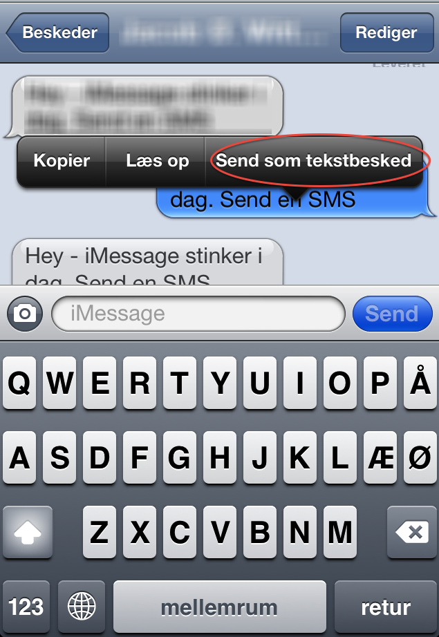 Det er ret simpelt at gøre. Når du netop har afsendt en iMessage, skal du bare trykke på den blå taleboble i et par sekunder og vælge "send som tekstbesked".