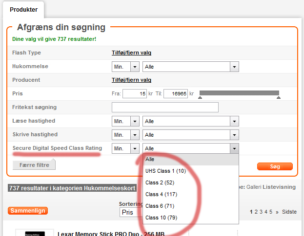 Det hele handler om, hvilken "Class" som hukommelseskortet er udstyret med. Class-Skalaen går fra 2, 4, 6 til 10, og "uden for kategori" finder vi UHS Class 1.