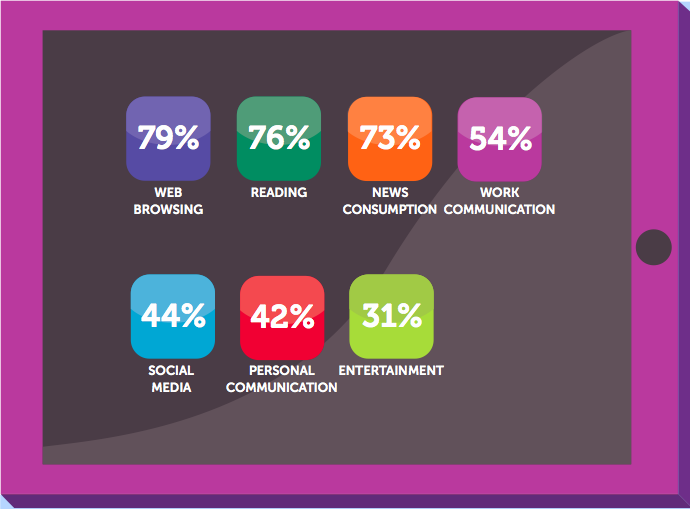 Et brugsmønster, der har mange lighedspunkter med det, som de adspurgte i IDG's undersøgelse oplyser. Her bruger 79 procent iPad'en til web-surfing, 73 procent til nyhedslæsning og 54 procent bruger den som kommunikations-redskab.