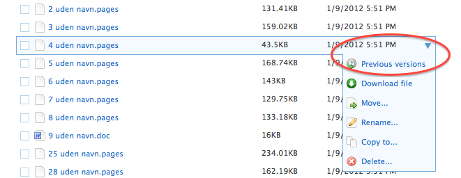 Dropbox gemmer alle versioner af dine dokumenter i op til 30 dage. For at se de tidligere gemte versioner skal du logge ind med dit brugernavn og kodeord på Dropbox.com. I oversigten over dine dokumenter klikker du på trekanten ude i højre side og vælger "previous versions".