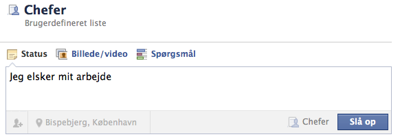 Som du kan se på billedet herunder, er jeg lidt af en brownnoser og skriver derfor en opdatering, hvor jeg fortæller mine chefer, at "jeg elsker mit arbejde."