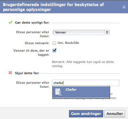 Her vælger du punktet "brugerdefineret", og under punktet "skjul for" kan du enten skrive navnet på nogle specifikke personer eller skrive navnet på din nyoprettede liste.
