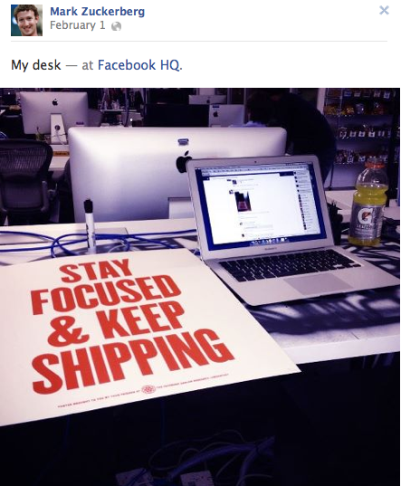 Det eksemplificeres måske bedst ved, at han samme dag som Facebook offentliggjorde sine børsplaner lagde et billede af sit skrivebord op på sin Facebook-profil.