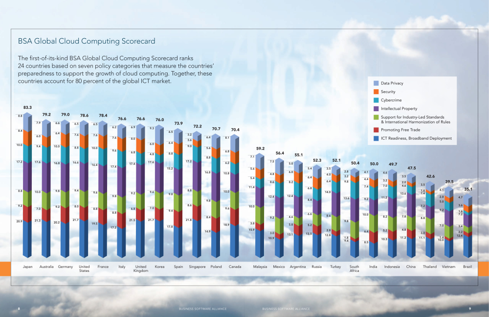 Top fem-placeringerne for markeder med de mest robuste cloud-politikker gik til Japan, Australien, Tyskland, USA og Frankrig.