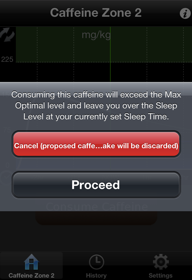 Eksempelvis fremgår det af app'en, at selv en dosis koffein sidst på eftermiddagen kan være skadeligt for din nattesøvn. Og skal vi tro app'en, er den bedste løsning, at du starter dagen med et stort koffein-indtag og løbende supplerer med mindre doser.