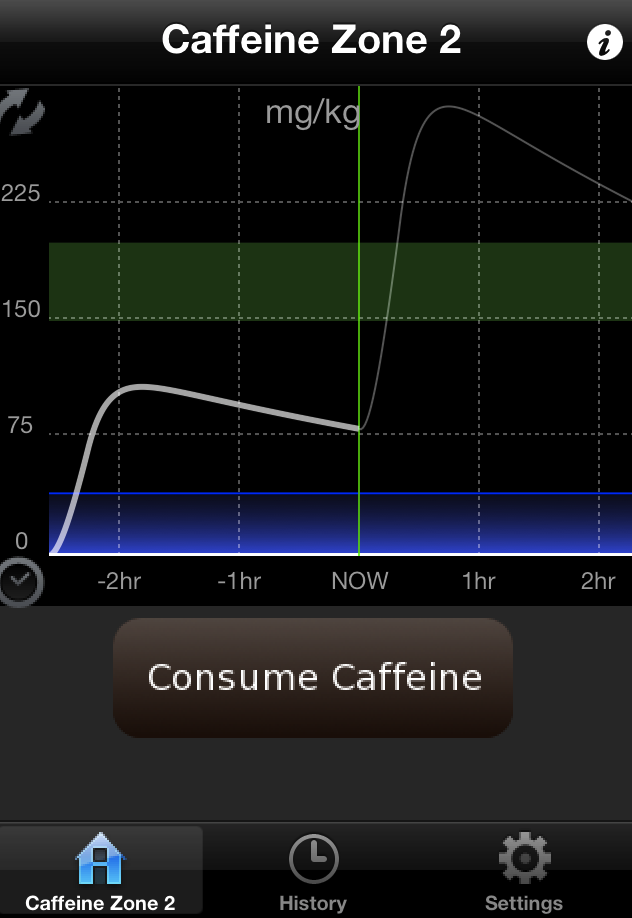 Dit koffein-forbrug bliver vist på en kurve i app'en, og på kurven er der angivet en grøn-zone, der viser, hvornår du får den optimale virkningen af koffeinen.