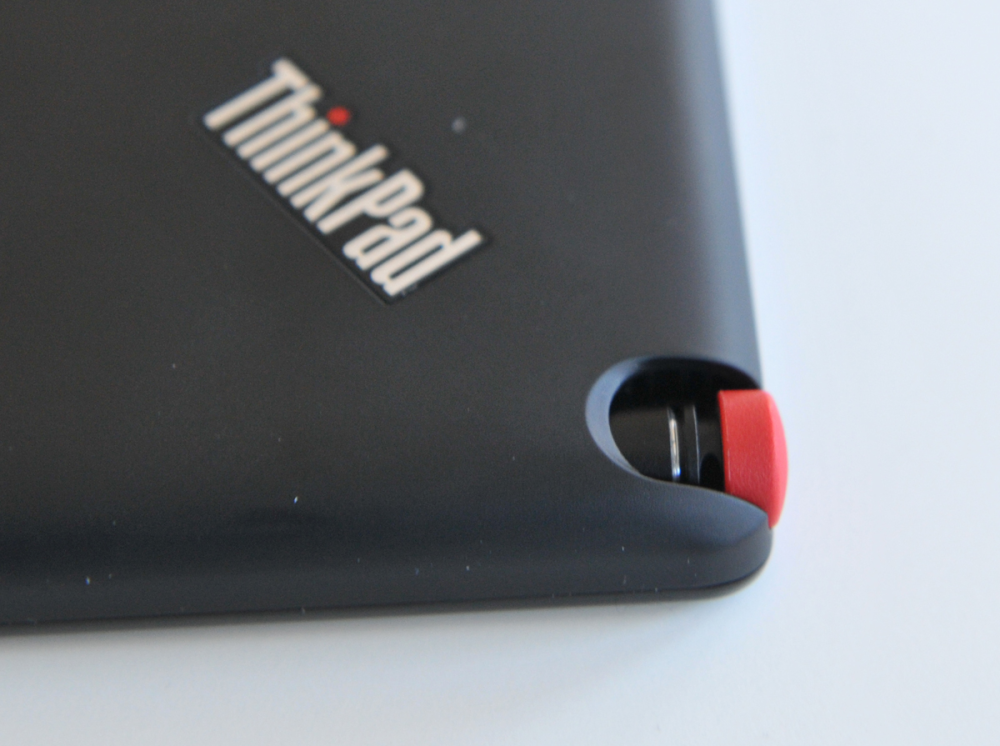 Enden på pennen er rød og stritter frem, og dermed er den med til at sætte ThinkPads klassiske røde fingeraftryk, der normalt er kendetegnet ved en trackpad midt i tastaturet på bærbare computere.