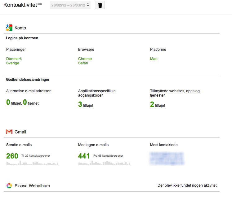 Ud over et indblik i din mailvaner giver den dig også et overblik over dine aktiviteter på andre Google-tjenester som Picasa, og hvis du bruger Googles gps-tjeneste Google Latittude, kan du også se oplysninger om, hvor du har bevæget dig i den fysiske verden.
