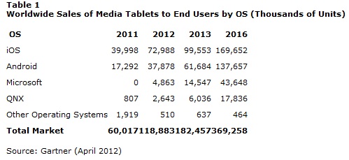 Analysefirmaets fremskrivelser placerer i 2012 Apples iOS på en klar førsteplads med en markedsandel på 61,4 procent.
