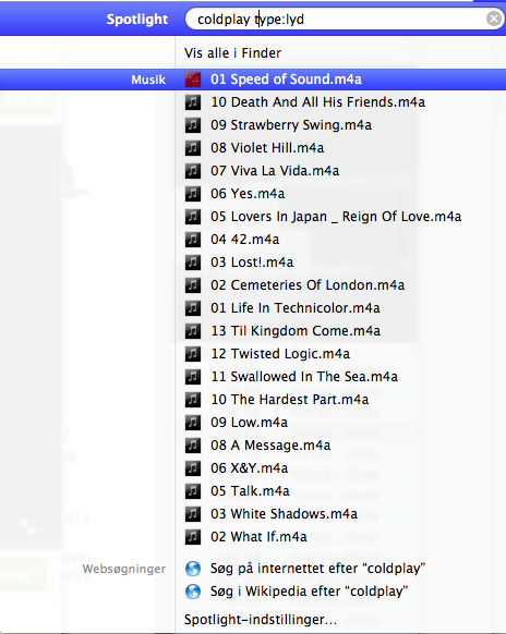 Leder du eksempelvis efter en sang med Coldplay, men er i tvivl, om den er gemt som mp3 eller i Apples eget m4a-format, kan du søge i alle dine lydfiler, uanset format, ved at skrive skrive: "type:lyd".