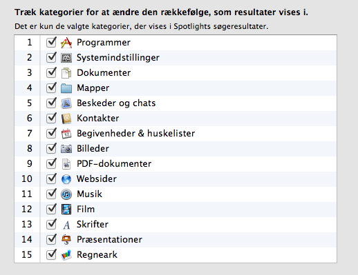 Ved at gå ind i "Spotlight-indstillinger" (dem finder du ved at klikke på Spotlight-symbolet og vælger Spotlight-indstillinger) kan du selv rokere rundt på rækkefølgen.