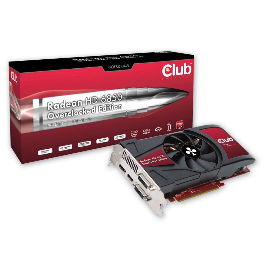 Det første, der springer én i øjnene, er grafikkortproducent og modelnavn. Førstnævnte er Club 3D, og betegnelsen "Radeon PCI-E HD6850 OC 1GB DVI/HDMI/DP" dækker hovedsageligt over, at chipproducenten AMD har leveret GPU'en (Graphics Processing Unit, grafikkortets processor).