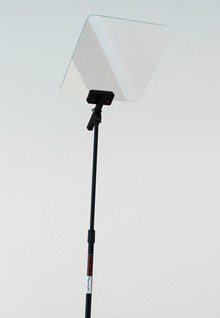 I stedet bruger de et diskret stativ med et særligt spejl til at aflæse, hvad der står på teleprompteren.