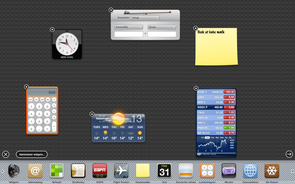 På dit Dashboard ligger der en masse små programmer - også kaldet widgets - som eksempelvis en lommeregner, en vejrudsigt og lignende programmer.