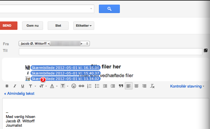 En anden genial måde at gøre det på, som de færreste kender, er ved at trække filerne over i mailvinduet. Du åbner blot den mappe, hvor filerne ligger, og herefter bruger du din mus til at trække filerne over i mail-vinduet.