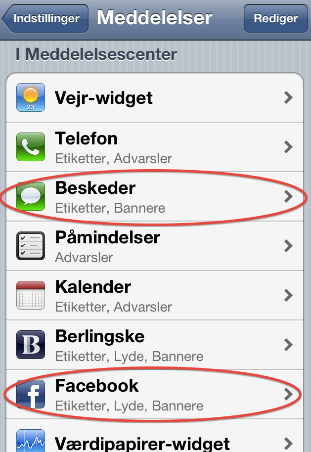 Og vil du også undgå, at dine Facebook-beskeder bliver vist på din iPhones skærm, skal du ligeledes gå ind under menupunktet "meddelelser" og ændre indstillingerne for din Facebook-app (har du installeret Facebook Messenger, skal du også ændre indstillingerne for denne app).