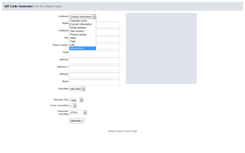 Start din browser og peg adressen ind på kodegeneratorens webside som nævnt herover. Klik på den øverste drop down-menu foran 'Contents' og vælg "Wifi network'. Siden vil nu blive opdateret med et nyt skema med tomme tekstfelter.