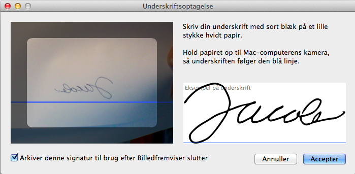 Nu får du muligheden for at skabe en standard signatur, der i fremtiden bliver brugt i Billedfremviser. Du klikker blot på muligheden "opret underskrift fra Facetime-kamera".