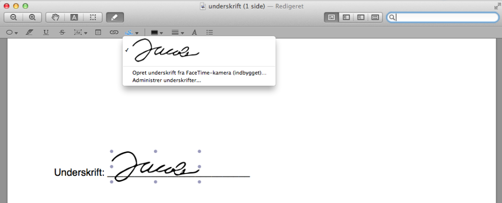 Du finder underskriftsfunktionen i programmet Billedfremviser (Preview, hvis du bruger en engelsk udgave af Mac OSX), der også er det program, din Mac som udgangspunkt bruger til at åbne pdf-filer.