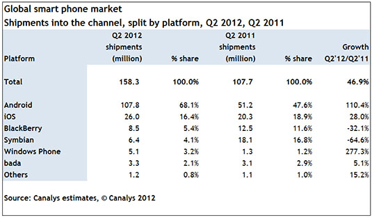 Android kom i andet kvartal af 2012 op på en samlet global markedsdandel for smartphones på 68,1 procent.