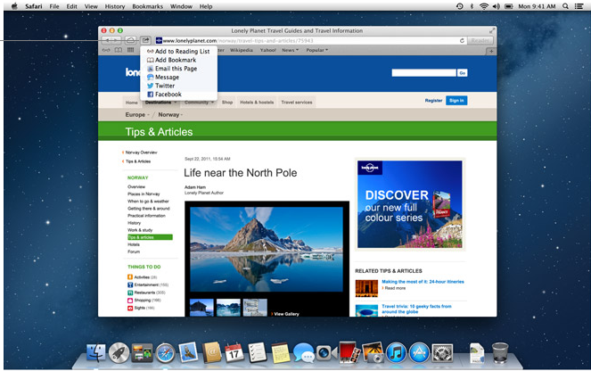 Du finder Del-knappen over alt i Mountain Lion. I Safari kan du med et klik på knappen hurtigt dele links, i Finder kan du hurtigt dele filer og i Kontakter-appen, kan du sende kontaktoplysninger afsted via mail eller iMessage.