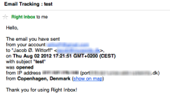 Når du i fremtiden skal sende mails, får du mulighed for at sætte kryds i feltet "Track", før du sender mailen. Og når modtageren åbner din mail, vil du modtage en kvittering, der fortæller dig, hvornår mailen blev åbnet, om der er blevet klikket på links i mailen, hvilken ip-adresse modtageren brugte, og hvor i verden vedkommende befandt sig, da han eller hun åbnede din mail.