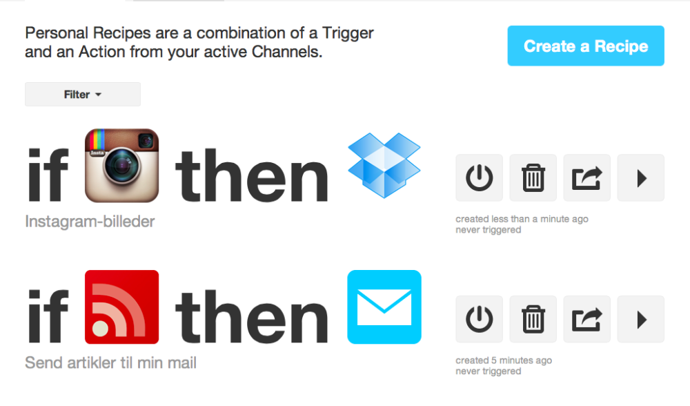 Og når du har lavet en ny opskrift, kan du dele den med andre IFTTT-brugere, og du har ligeledes adgang til et helt bibliotek, der består af andre brugeres opskrifter.