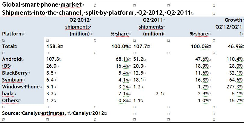 For første gang blev der solgt mere end 100 millioner Android-baserede smartphones i et enkelt kvartal (Q2 2012), og Android-telefoner er nu oppe på en markedsandel på 66 procent.