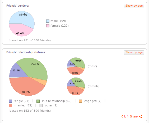 Eksempelvis opdagede denne skribent, at han havde flere mænd som Facebook-venner end kvinder. Men til gengæld var der flere kvinder end mænd, der var singler (WIN!, red).