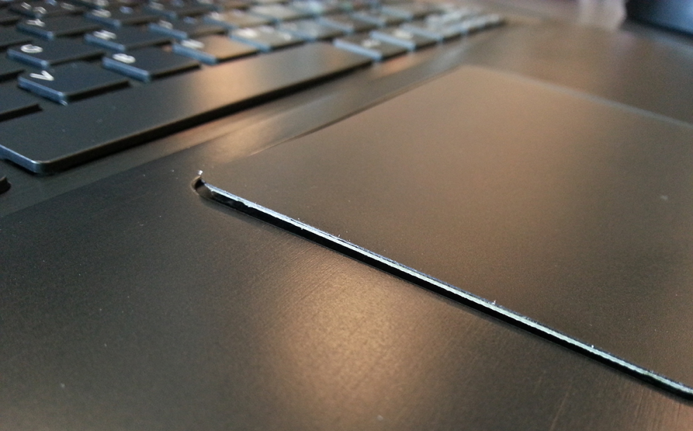 Den er bøjet en smule op i venstre side og gaber dermed nogle millimeter. Det er ganske enkelt ikke holdbart, da der kan ryge skidt ned under touchpaden.