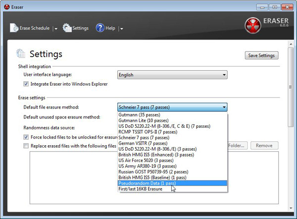 Eraser har en masse avancerede indstillinger til blandt andet at definere en tidsplan for diverse opgaver, hvis du jævnligt har brug for at slette specifikke filer eller sektorer på din harddisk. Vær forsigtig, når du roder med de avancerede indstillinger, så du ikke ved et uheld sletter en fil, der ikke skulle slettes. Vær også opmærksom på, at Eraser kun er designet til anvendelse med mekaniske harddiske, da solid state-drevs såkaldte wear leveling-algoritmer bevirker, at dette værktøjs tilgang ikke er hensigtsmæssigt.