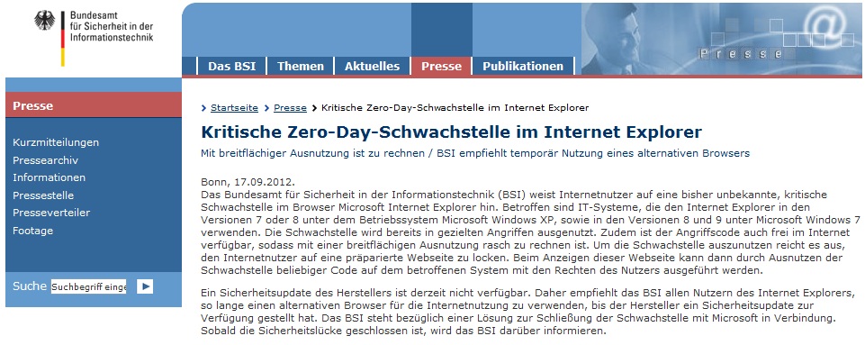 Tysklands instans for it-sikkerhed, Bundesamt für Sicherheit in der Informationstechnik (BSI), var lidt hurtigere på aftrækkeren, og udsendte den 17. september en pressemeddelelse, hvori BSI anbefaler tyske borgere, der i dag benytter Internet Explorer, at skifte til andre browsere.