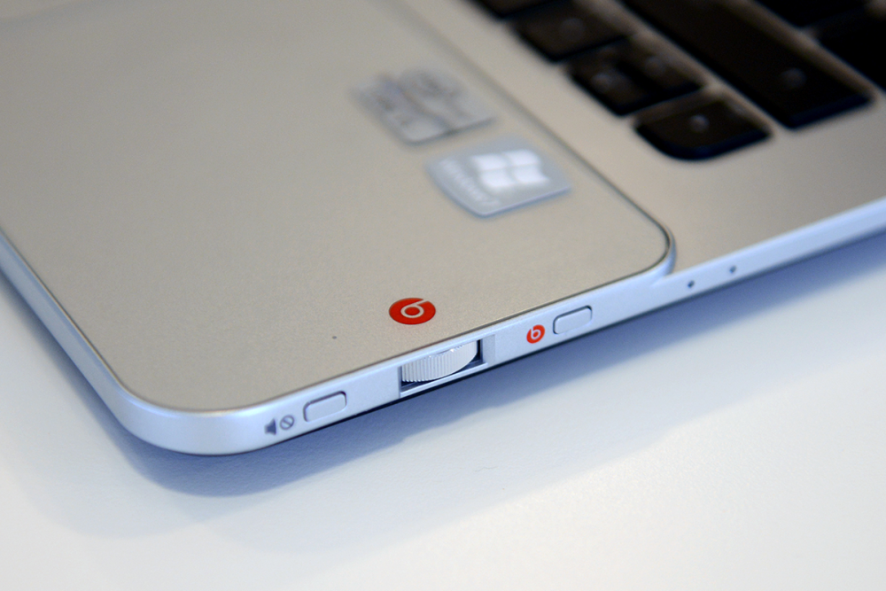 Volumenknappen er flankeret af to andre knapper. Den ene kan mute al lyd, mens den anden aktiverer indstillingsmenuen for Beats Audio, som computeren er udstyret med.