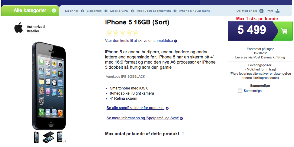 Elektronikkæden Elgiganten har på sin webshop offentliggjort priserne på den nye iPhone 5, og står priserne her til troende, kommer en iPhone 5 til at koste 5.499 kroner for 16 GB-versionen.