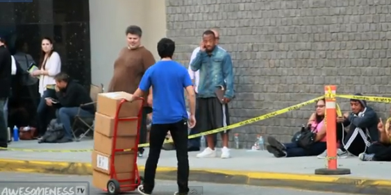 Udklædt som en rigtig Apple-ansat kommer en mand forbi de lange køer med en sækkevogn fyldt med papkasser.